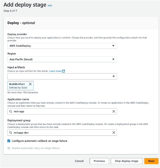 바로 위에서 생성한 S3 버킷을 Artifact로 지정해줍니다.