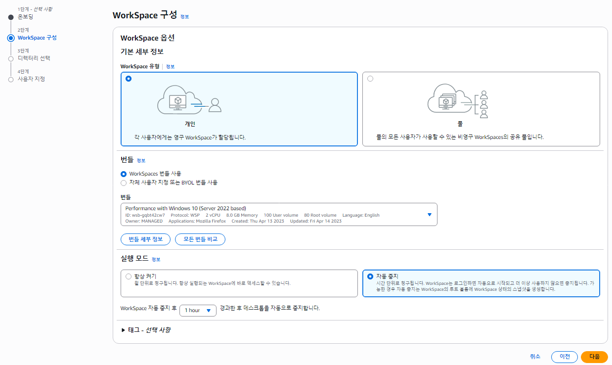 WorkSpaces 번들 사용 후 원하는 OS 버전 선택 후 다음