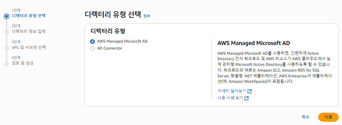 10-3. AWS Managed Mirosoft AD 선택 (기존 AD 연동 시 AD Connector 선택, 본 실습에서는 관리형 AD를 사용)
