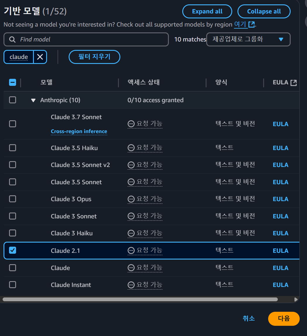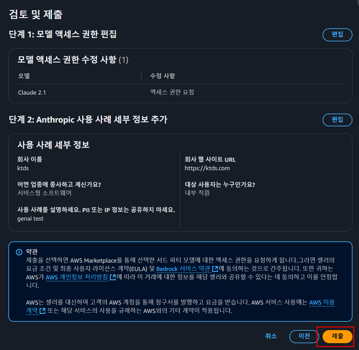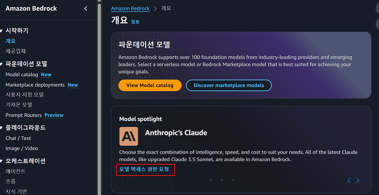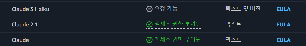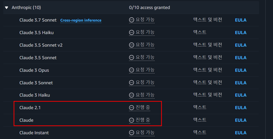 사용하기 전에 AWS Bedrock에서 해당 모델을 활성화 진행합니다. Claude 모델 사용할 예정입니다.