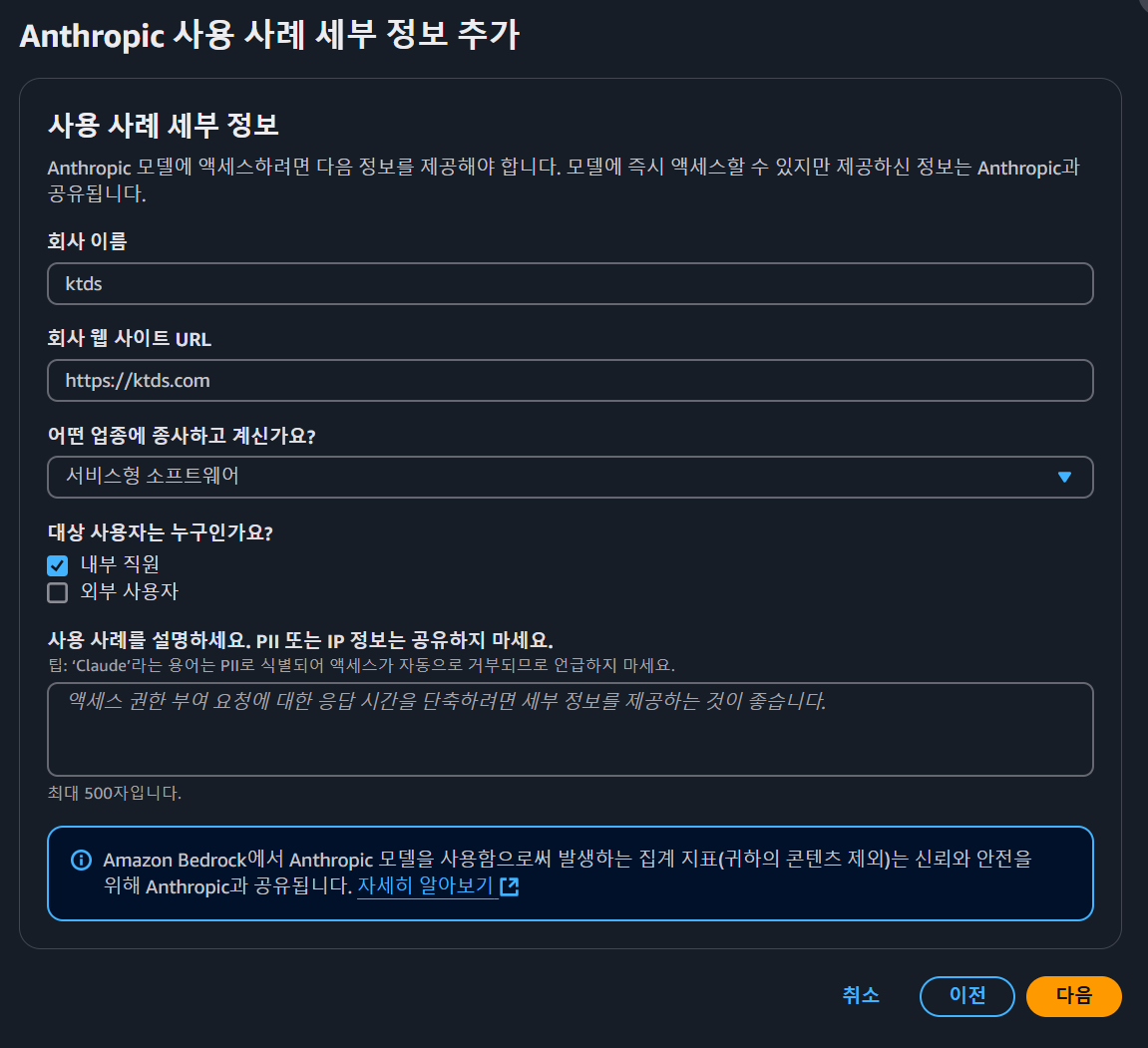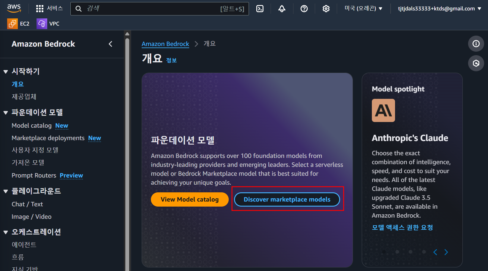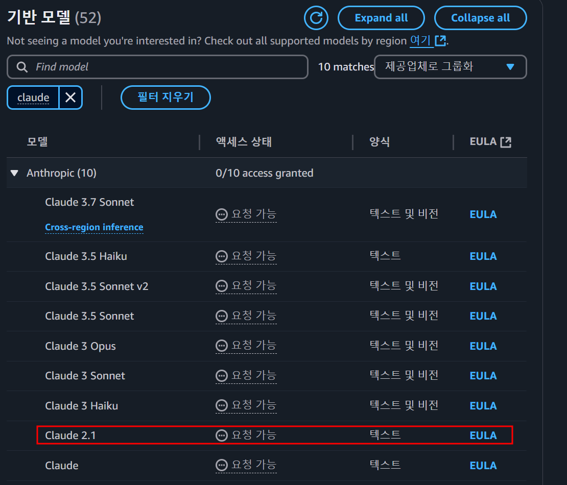 사용하기 전에 AWS Bedrock에서 해당 모델을 활성화 진행합니다. Claude 모델 사용할 예정입니다.