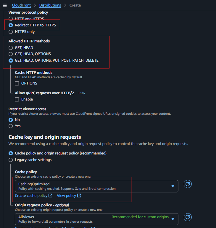 3) Viewer protocol policy "Redirect HTTP to HTTPS" 선택