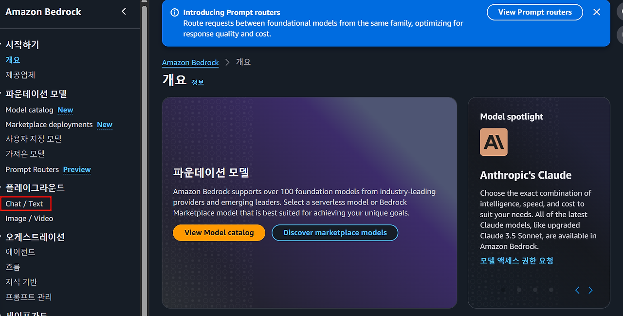 - 모델 제공자 선택 가능: Amazon, Anthropic, AI21 Labs, Cohere, Meta, Mistral, Stability AI 등 다수 모델 제공자(FM Provider) 지원