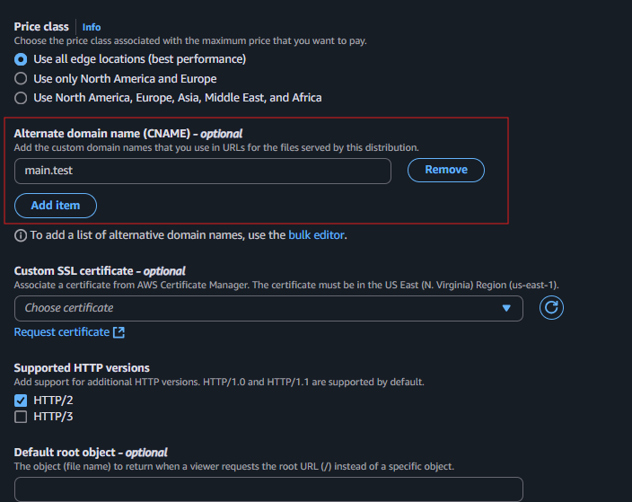 6) Alternate domain name (CNAME) - optional = "사용할 도메인 명 입력"